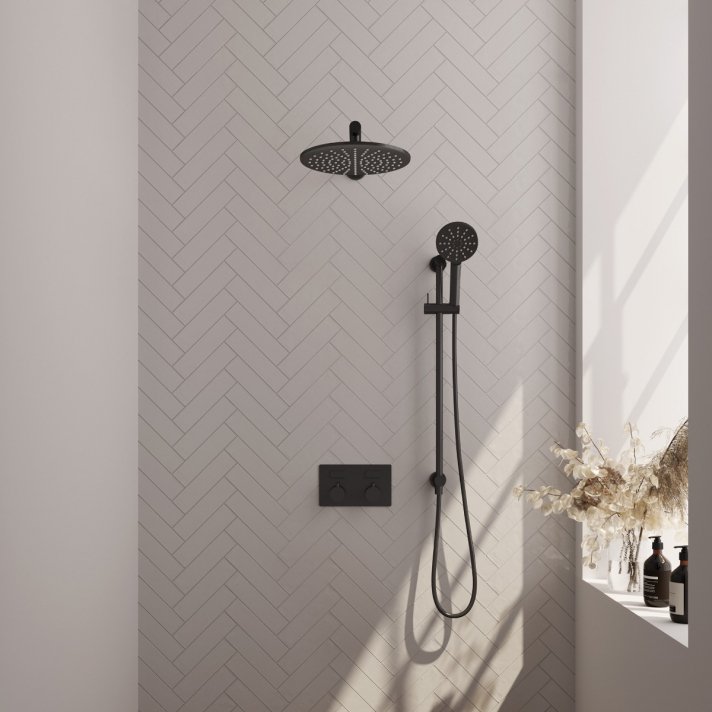 BRAUER Black Edition thermostatische inbouw regendouche met drukknoppen SET 68 met 30 cm douchekop en rechte muurarm en 3-standen handdouche en doucheslang en geïntegreerde glijstang mat zwart