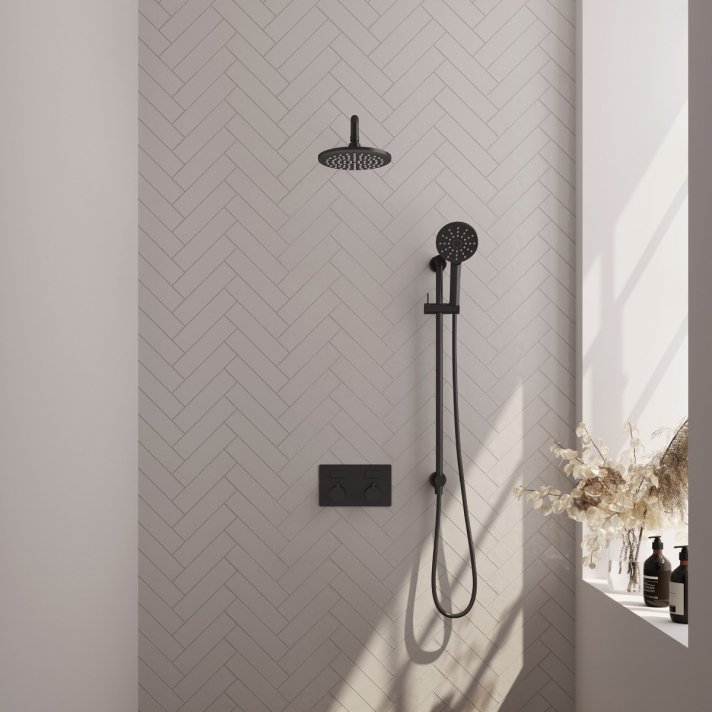 BRAUER Black Edition thermostatische inbouw regendouche met drukknoppen SET 69 met 20 cm douchekop en gebogen muurarm en 3-standen handdouche en doucheslang en geïntegreerde glijstang mat zwart