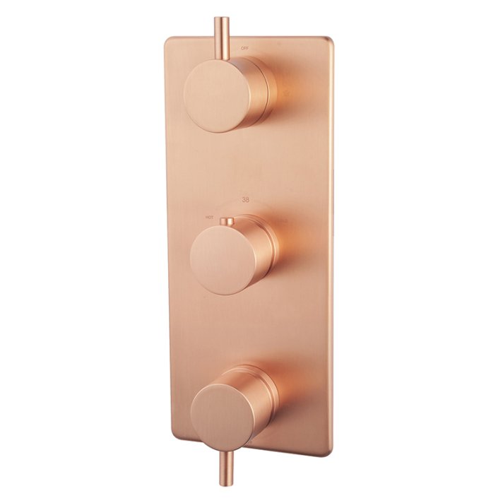 Deze afbouwset is gemaakt van messing en heeft een geborsteld koper kleur. Dit maakt het een echte eyecatcher. In combinatie met andere geborsteld koper elementen van Wiesbaden Sanitair creëer je een moderne eenheid in de badkamer. De Caral douchekraan afbouwset 3-weg messing van Wiesbaden Sanitair bestaat uit: