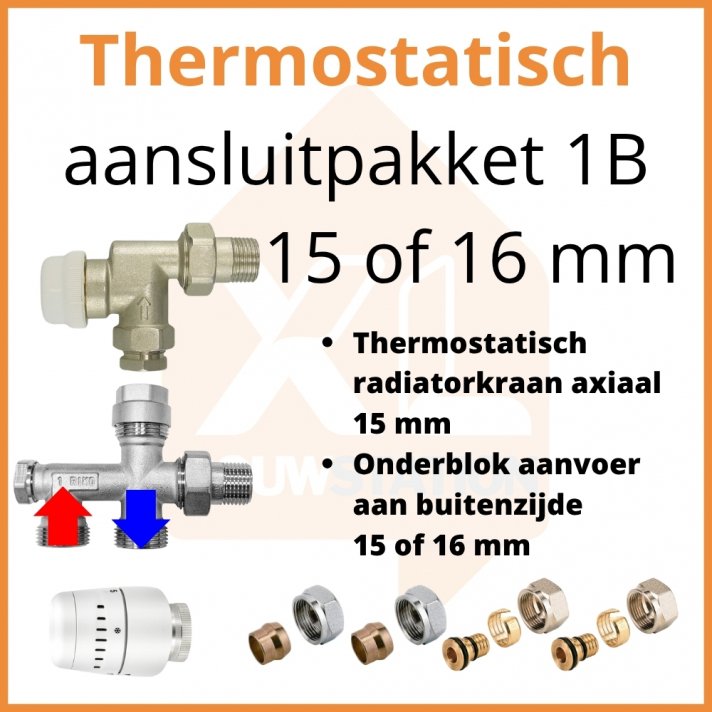Thermostatisch aansluitpakket 1B ā geschikt voor 15 mm of 16 mm buizen Dit aansluitpakket is geschikt voor radiatoren met een zijaansluiting (zoals Eco 4 radiatoren), waarbij de leidingen uit de vloer aan de zijkant van de radiator komen.