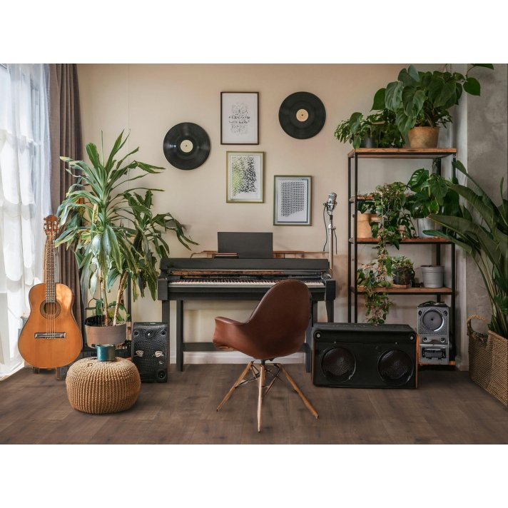 - Authentiek design: Het laminaat heeft een rijke donker eiken uitstraling die naadloos aansluit bij zowel moderne als traditionele interieurs. Met de hoogwaardige 4-zijdige V-groeven krijgen de planken een extra dimensie, die het natuurlijke karakter van echt hout perfect nabootst.