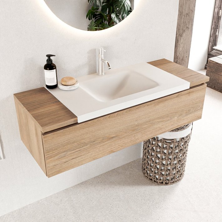Mondiaz Bukla 120cm badmeubel onderkast kleur Washed Oak met 1 lade. Wastafel Cloud midden 1 kraangat kleur Talc.