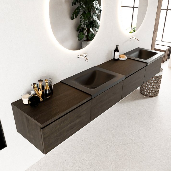 Mondiaz Bukla 240cm badmeubel met module 60 links kleur Dark Brown met 4 lades. Wastafel Cloud dubbel 0 kraangaten kleur Urban.